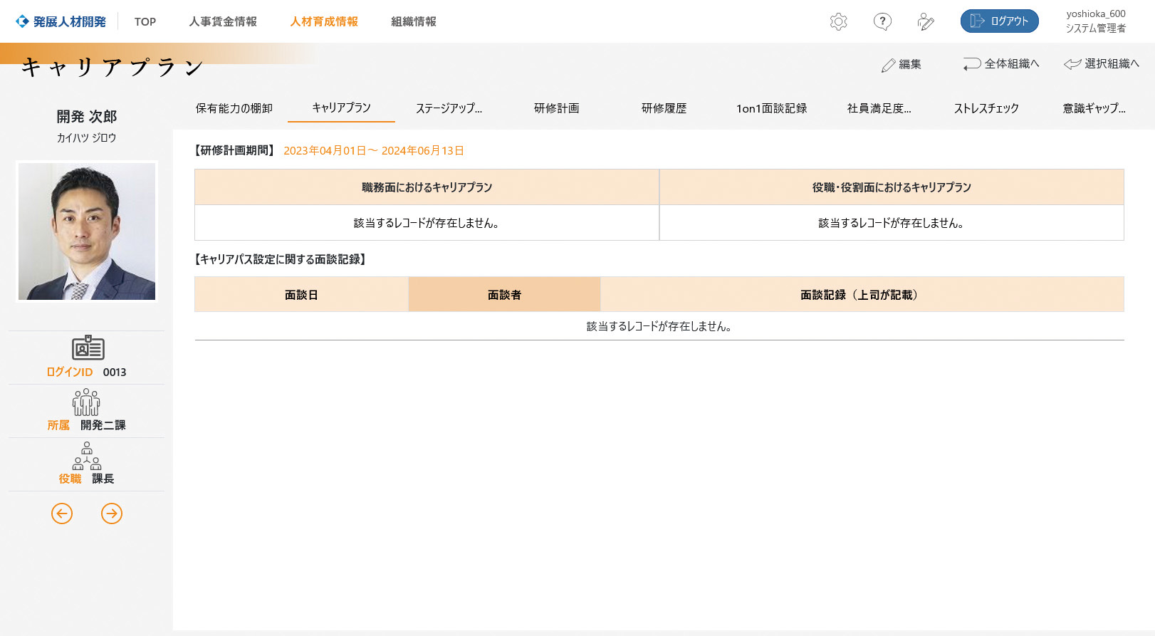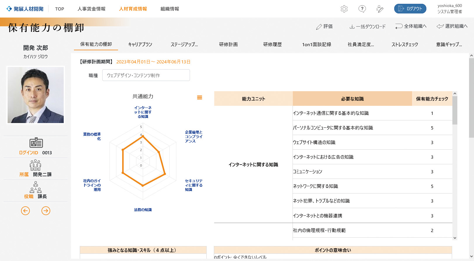 「人事育成情報」は、社員が現在保有している能力の棚卸の実施と、これまで受講してきた研修を把握することで、今後の育成課題をまとめ、今後の育成計画(研修計画)の立案につなげるカテゴリーです。短期的な課題だけでなく、将来のキャリアプランと1on1面談の内容とリンクした育成が可能になります。