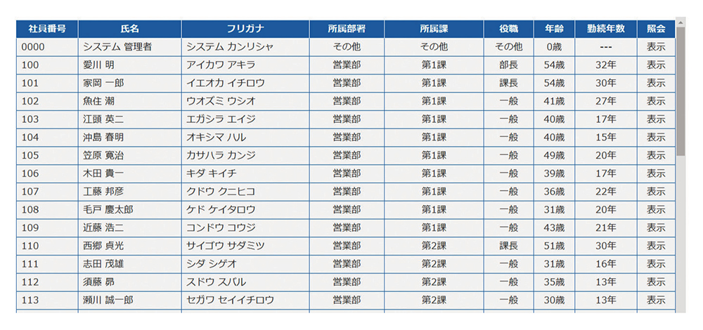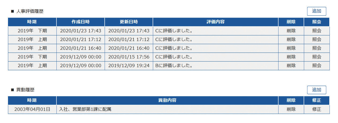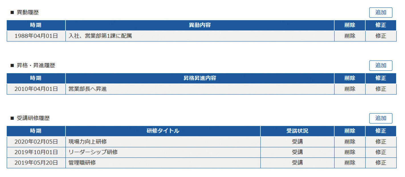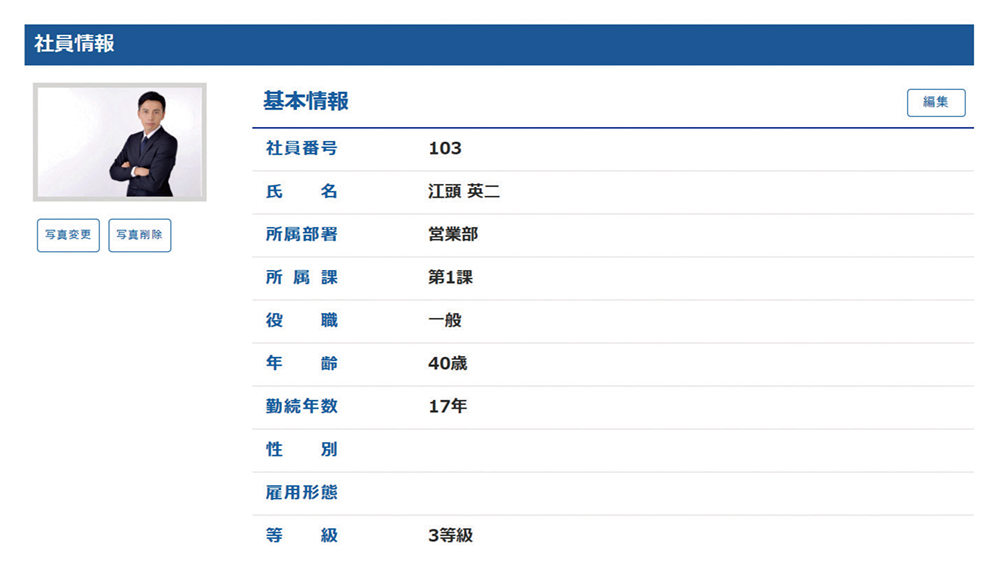 発展人事評価 全人事情報をクラウドで一元管理 入社・異動・昇進・研修履歴など全人事情報をクラウドで一元管理 全社員の人事情報を顔写真入りで一元管理 社員の人事情報は写真入りで一元管理することができます。社員数が多くなると社員の顔と名前が一致しなくなってしまいます。さまざまな人事情報を写真入りで管理することで、管理職の悩みを解消することにも役立ちます。 入社から退職までの様々な人事履歴をすべて記録可能 社員の人事履歴をクラウド上で管理できます。人事評価結果だけでなく、異動、昇格、昇進の履歴、保有資格などもすべての人事情報の管理が可能です。権限の設定により、閲覧可能な役職者の範囲も制限できますので、個人情報保護対策も万全です。 人事評価履歴は自動的に反映 人事評価の結果は、評価が確定した後で社員情報ページに自動的に反映されます。人事評価結果の個人別管理を自動で行うことができます。