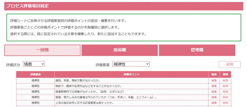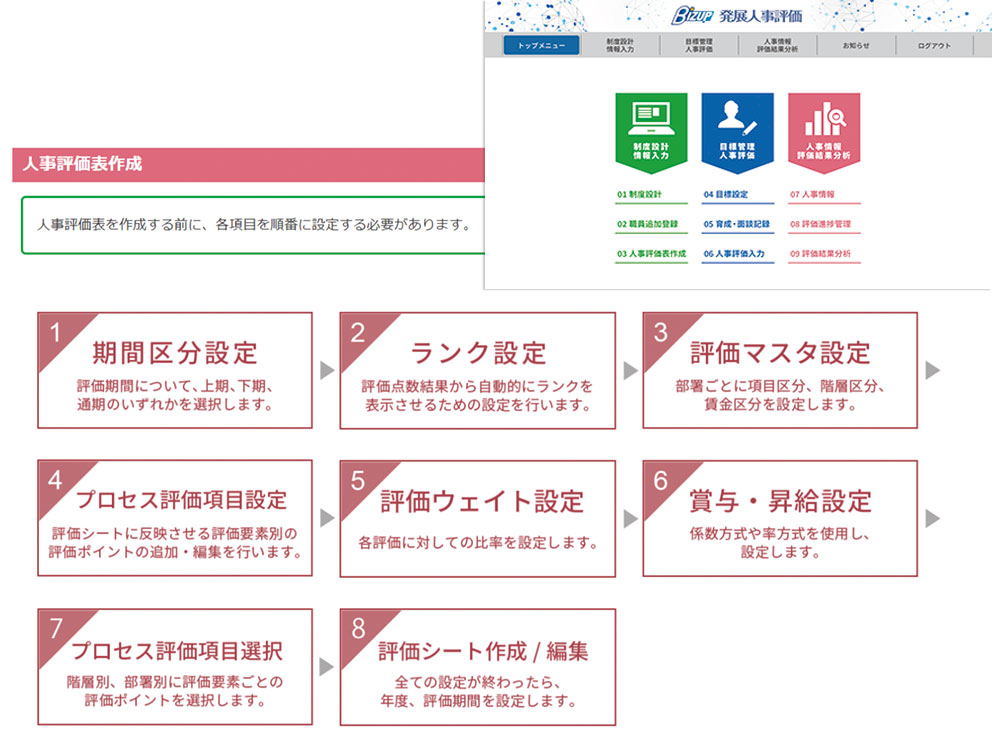 発展人事評価 スムーズな評価制度導入を実現 ガイドフローによるかんたん操作でスムーズな評価制度導入を実現 フローに従って進められるスムーズな制度設計画面 人事評価表も、フローチャートに項目を入力していくだけで自動的に作成されるので、人事評価についての知識が少ない方でも設計することができます。 プロセス評価、目標管理、業績評価の3区分のカテゴリーの組み合わせが可能で、プロセス評価における具体的な評価文章は豊富な例文から選択でき、自法人オリジナルの文章を追加することもできます。 評価ウェイトの設定、昇給・賞与への反映の方法も設定することができ、賃金体系との親和性も非常に高くなっています。 役職別に権限設定が可能 人事評価に関わる人物の権限を設定して、センシティブな人事情報へのアクセスに対するセキュリティを万全にします。 評価項目は標準装備の文例集からの選択式 プロセス評価で大事なことは、評価項目別に具体的な評価ポイントとなる行動例を示すことです。しかしながら、白紙の状態から行動例を考えるのは非常に労力を要します。 発展人事評価では、過去のコンサル実績から蓄積したノウハウをもとに、豊富な評価ポイント文例を盛り込んでいます。自法人にとって重要と思われる文章を選択し、文章を一部修正することも可能です。また、新規で文章を追加することもできるので、簡便性と自由度を共存させています。