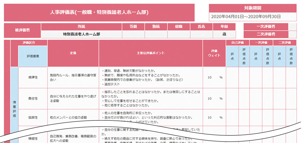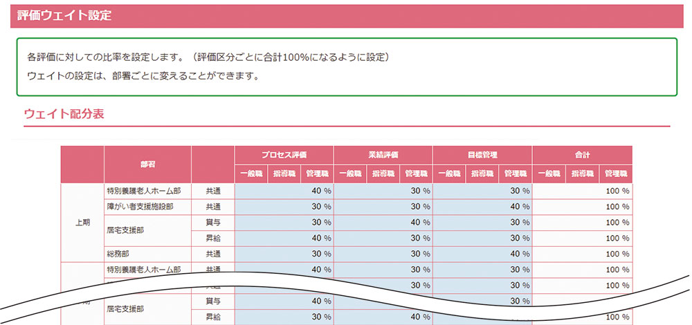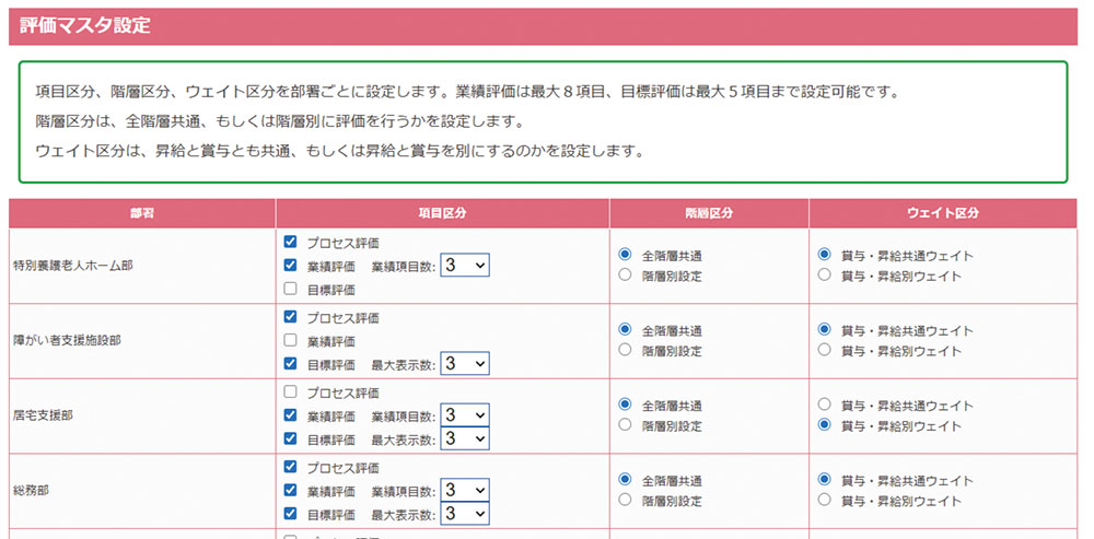 入所系と在宅系など、事業所によって評価の対象となる項目を変えられるため、例えば在宅系だけ業績評価を採用し、入所系では業績評価を採用せず、目標管理を採用するといったカスタマイズが可能です。