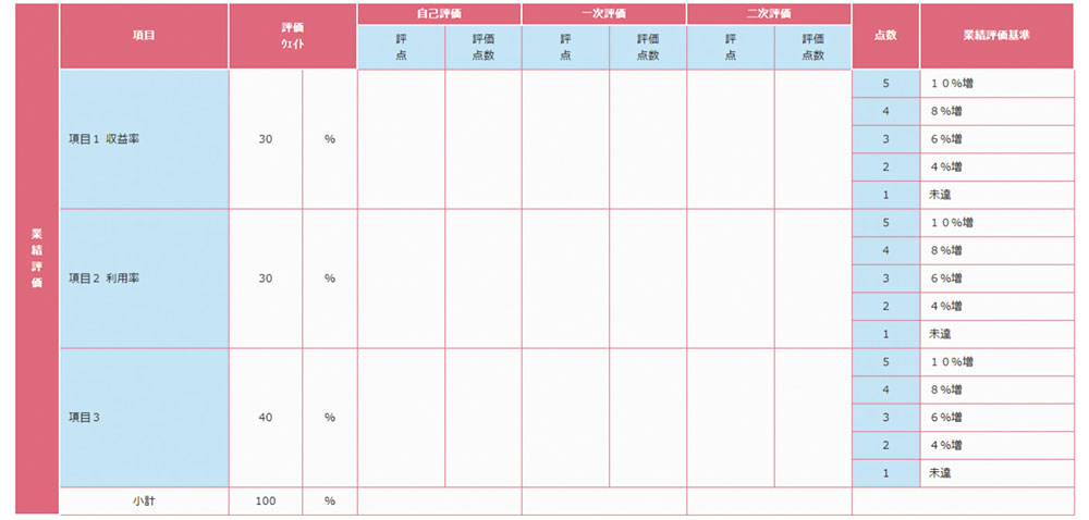 業績評価を導入する場合でも、各事業所によって評価基準は当然異なることが想定されます。収入で評価する事業所、稼働率で評価する事業所など、カスタマイズが可能です。