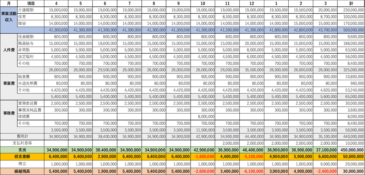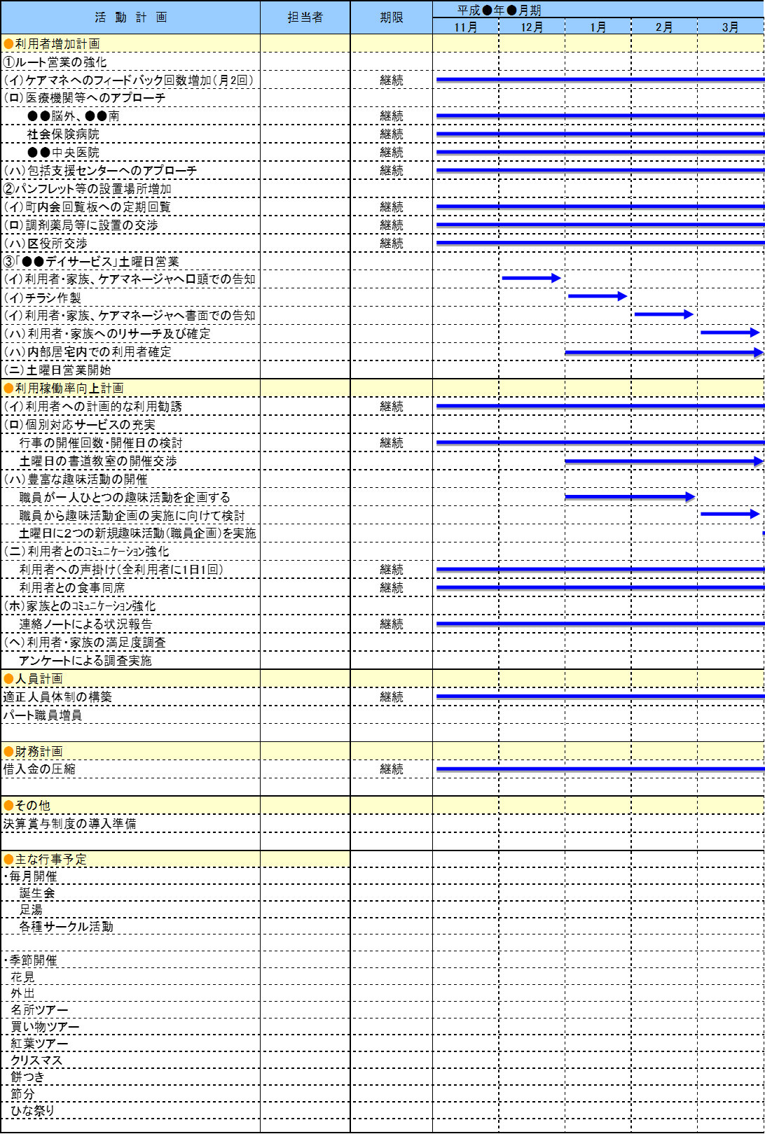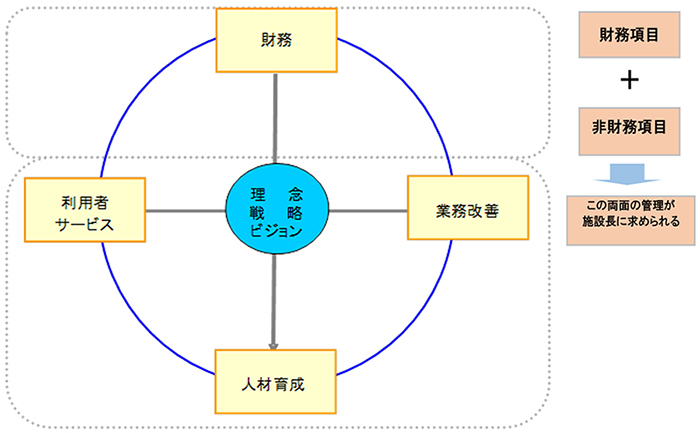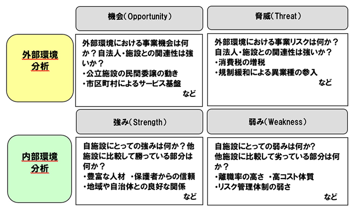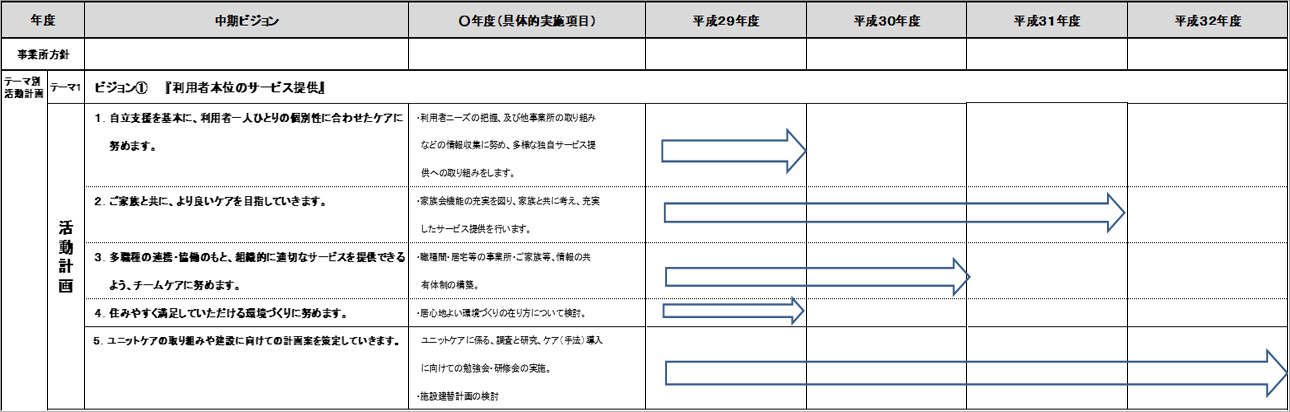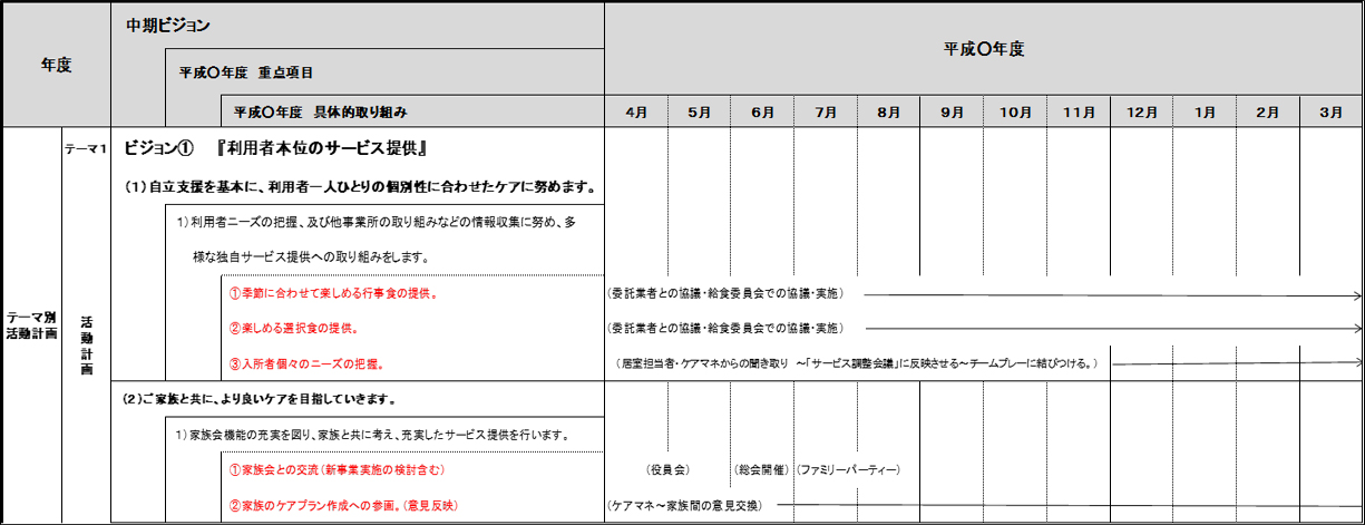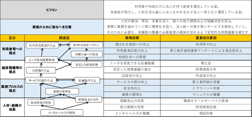 社会福祉法人コンサルティング 中期経営計画策定コンサルティング 福祉施設には地域に根差した安定したサービスの提供が求められます。福祉施設を取り巻く経営環境の変化は年々厳しさを増している中で安定した経営基盤を築くためには、中長期的な視点に立った経営計画が必要になります。 福祉施設を取り巻く環境の変化 外部環境 ・報酬改定による収益の減少 ・株式会社等の参入による競争激化 ・制度改正への対応による費用増大 ・労働力人口の減少による採用難 ・働き方改革を始めとする政策への対応 など 内部環境 ・法人の将来不安による職員の不安感増大 ・人件費率増加による収益性の低下 ・職員の定着率の低下 ・役割・権限が不明確で非効率な経営 など ビジョンの策定 将来の事業経営において周辺環境が厳しくなっていく中で、福祉施設が生き残るためには環境に適合していく必要があります。このような厳しい環境の中で経営していくためには、ビジョンの設定が重要になります。明確なビジョンを設定することにより、理念実現に向け将来の方向性を具体的に描くことが可能になるためです。 将来の地域福祉ニーズに応えるための事業構想の中で、どの位の資金が必要で、法人の保有資金で足りるのか、借入が必要なのか。また、新しい施設のリーダーは誰が担当するか、既存施設から何名選出するのか等、法人のビジョンを設定することは、経営戦略策定のもとになり、必要な経営資源(ヒト・モノ・カネ・情報)の適性配分の根拠となります。 ビジョンの位置づけ ビジョンは、法人組織としての使命や目的、機能を包含するものです。 そうしたビジョンをもとに経営戦略や中長期の経営計画を立案すれば、方針⇒目標⇒計画といった一連の組織的活動の方向づけが行えることになり、一体的な経営管理を実現することができます。 SWOT分析と経営課題の整理 ビジョンを実現するためには、経営環境分析を行い、自法人の置かれている位置を正確に把握する必要があります。その代表的な手法が「SWOT分析」です。SWOT分析では、施設を取り巻く環境を外部と内部に区分し、縦軸を外部環境と内部環境に分け、横軸を好影響と悪影響に分け、マトリックス(格子状の枠)により自法人の環境を客観的に分析します。 SWOT分析例 SWOT分析により経営課題を抽出したら、その優先順位をつけていきます。その際、全社課題が優先されますが、法人内の事業所ごとにも優先順位を付けます。ビジョン実現に向け、限られた経営資源を有効に使っていくためにも、優先順位付けは重要です。 課題の優先順位付けの例(時間管理のマトリクスと呼ばれる考え方) トータルマネジメントの視点に基づいた戦略マップの策定 トータルマネジメントとは、法人が進むべき方向をビジョン・戦略で明確にした上で、財務、非財務の両面を、バランスよく統合的に取り入れていくマネジメント手法です。 トータルマネジメントの視点で中期経営計画を作成するために、バランスド・スコアカード(以下BSC)という手法を使うと、バランスの取れた中期経営計画を作成することができます。 福祉施設トータルマネジメントの体系 BSCは上記の4つの視点でまとめるのが一般的ですが、福祉施設においては、これに「地域」の視点を加えた5つの視点でまとめることをお勧めします。 5つの視点で戦略を整理し、漏れや偏りのないように戦略の全体像を組み立てていきます。各経営戦略をマップ状に配置し、全体をイメージしやすいように並べます。 戦略マップ全体イメージ図 資金計画への反映 施設整備資金、大規模修繕など固定資産に関係する項目は、3~5年の中期経営計画期間中に、積立資産をあるべき水準に到達できないものもあります。その場合は、中期よりもさらに長期間の計画を踏まえた上で、単年度に落とし込んでいきます。 資金計画書5ケ年 例 必要資金総額から各年度単位で必要な年額まで落とし込み、金額を掴んだら当初予算に組み込み、月次展開して進捗管理し追っていきます。 5カ年資金計画を事業計画と整合性を持たせ、当初予算を作成します。作成された当初予算をもとに月次展開した単年度資金計画書を作成します。 単年度の資金計画への展開 単年度計画は月次で数字を展開させて管理していきます。その際予算額を12ヶ月の均等割りにするのか、ある程度時期が決まっているのか、詳細を記載します。 資金計画への反映 施設整備資金、大規模修繕など固定資産に関係する項目は、3~5年の中期経営計画期間中に、積立資産をあるべき水準に到達できないものもあります。その場合は、中期よりもさらに長期間の計画を踏まえた上で、単年度に落とし込んでいきます。 年間シート例 年間シートで中期経営計画全体像を描いた後、年度ごとの活動計画シートに落とし込みます。年度計画シート作成後、事業計画書を作成し、当初予算に反映させます。 年度計画シート例 (一部抜粋) 年度計画シートは、誰がどこまでやるのかな