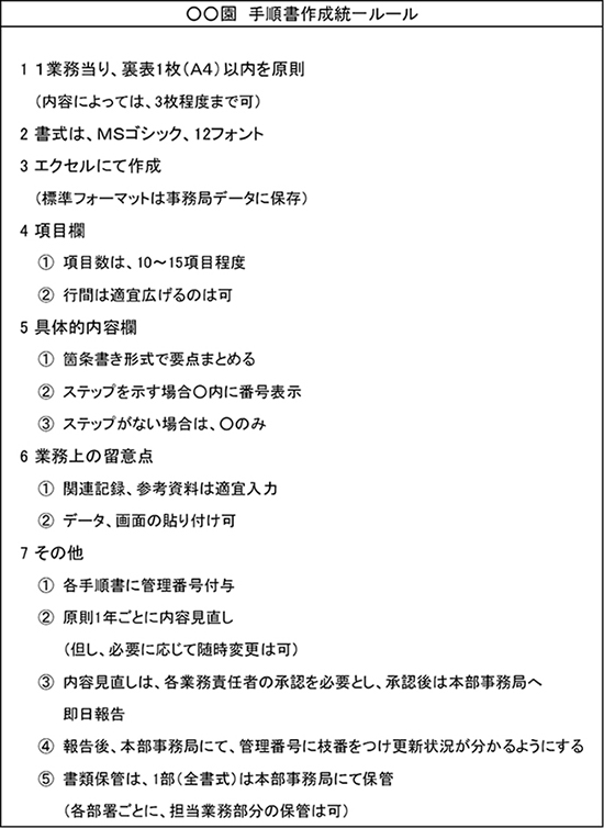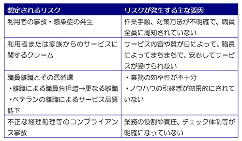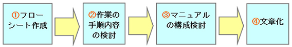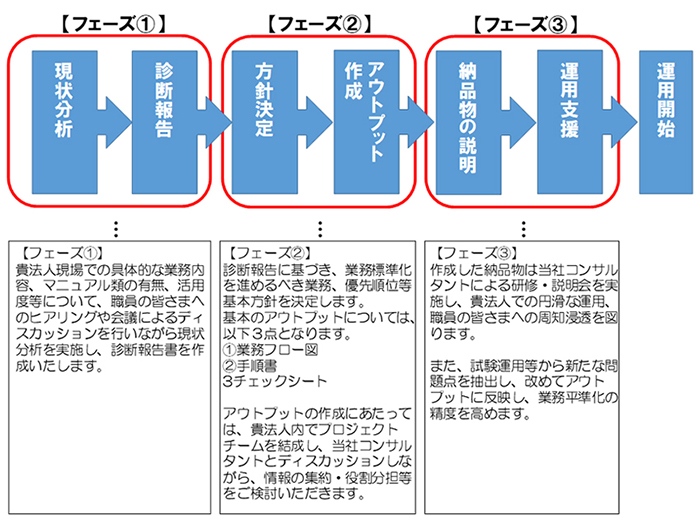 社会福祉法人コンサルティング 業務標準化コンサルティング 地域社会における公益性が強く求められる社会福祉法人においては、その大きな社会的責任を果たしていくために日々多様化・複雑化している福祉ニーズに的確に対応し、利用者一人ひとりが満足を得られるようなサービスを提供していく必要があります。その一方で、福祉現場で直面するリスクも多岐にわたり、法人経営における大きな課題となっています。 これらのリスク要因を解消し、法人の経営課題をクリアしていくためには、合理的に業務内容と手順・役割を見直し、サービス効率を向上させるとともに、職員全員が同じ方針、方法でサービスを提供できるようにするための枠組みを構築する、すなわち、「業務標準化」を実現していくことが重要です。 福祉サービスの現場における様々なリスクとその要因 マニュアル作成手順 フローシート作成 行っている業務全てを順に文章で書き出すのには、相当な慣れが必要となります。一般には、初めに工程表(フローチャート)に記入する方法がよいでしょう。 短い文章で、各工程を表し、それを矢印でつなぎます。留意事項や作業者数、作業時間などを項目に記入すると便利です。 この作業工程表は、マニュアルの作業ガイドだけでなく、目次の役割を果たすことも可能になります。 フローシートモデル 作業の手順内容の検討 図や留意事項があった方が解りやすいケースもあります。その場合、どこに入れるかを検討します。 またマニュアルはどの業務においても共通の様式で作成しますが、章や節、作業の分け方、文章の書き方、文字のフォントなどの細かい点も検討しておくことが望ましいです。 マニュアル構成検討例 文章化 文章は、何回も複数の職員の目を通して読み返し、解りやすくなるよう丁寧に作成します。また、文章にしてみると、図やチャートの効果が大きいことが分かってきます。 これを繰り返すことで、よりよい手順書になります。 フローチャート形式のマニュアル例 業務平準化支援コンサルティングの流れ 貴法人の現状分析に基づき、法人現場に合ったマニュアル・フロー・チェックシートの整備と研修も含めた運用支援を行うことで、貴法人の業務平準化の実現をご支援いたします。